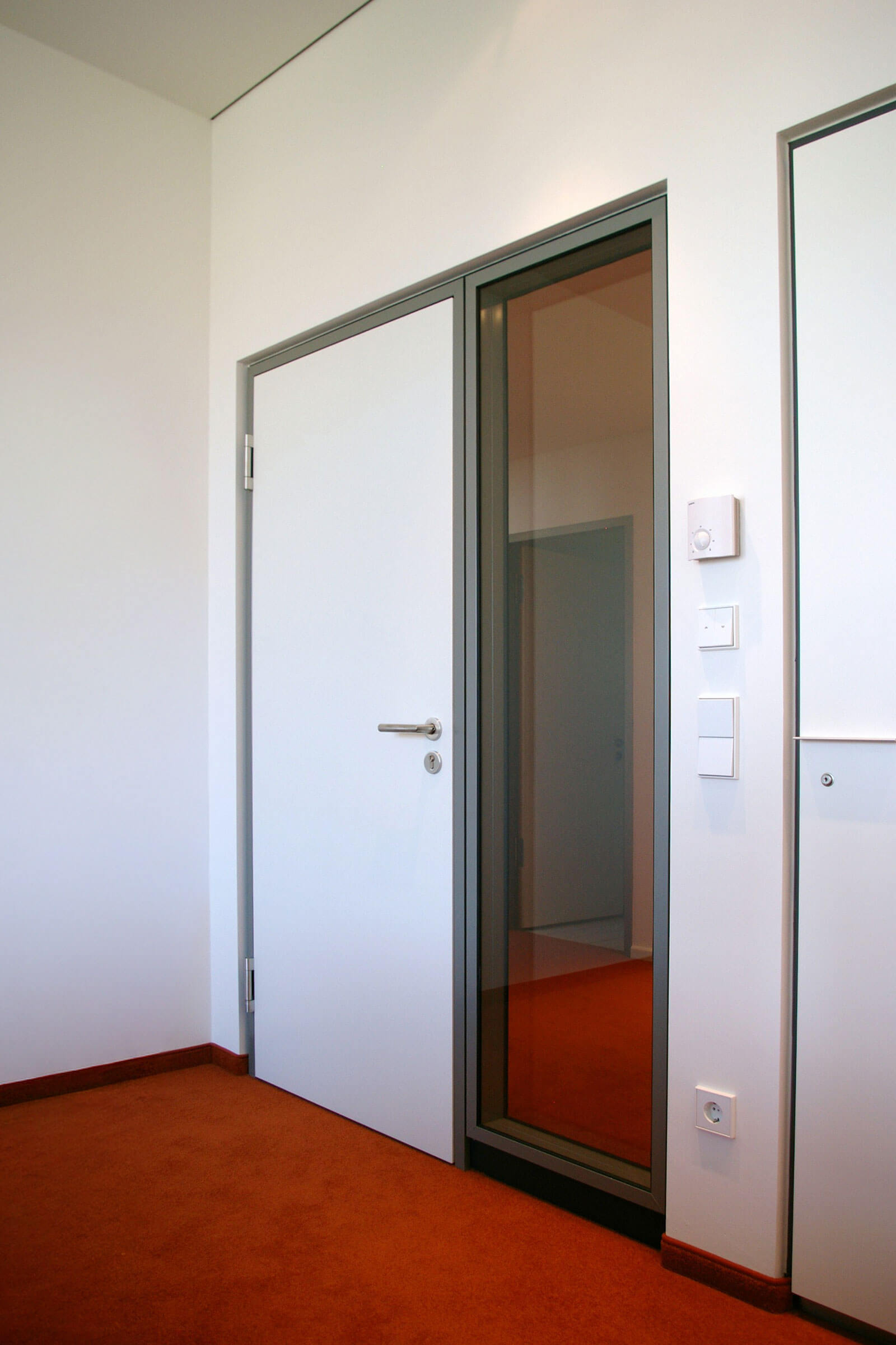 In das JACOBS-Trennwandsystem lassen sich mit Hilfe unserer vier unterschiedlichen Aluminiumzargen verschiedenste Türen integrieren. Neben den klassischen Objekttüren aus Holz mit oder ohne Lichtausschnitt sorgen unsere Ganzglastüren für mehr Transparenz.